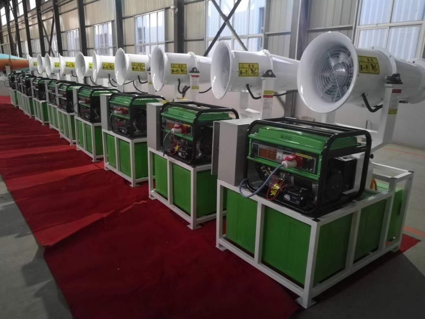 雾炮机根据液体雾化和空气射流理论,先使用高压泵对液体加压,然后通过微细雾化喷嘴将水雾化,在利用高压射流风机的大风量和高风压将雾化的水雾送到较远距离,使得水雾到达较远距离的同时能够覆盖 大面积,在此过程中粉尘颗粒与水雾颗粒产生充分接触而变得湿润,被湿润的粉尘颗粒继续吸附其他粉尘颗粒而逐渐凝结结成颗粒团,然后粉尘颗粒团由于自身的重力作用而沉降,从而达到抑尘,降尘的作用,降低空气中的PM2.5浓度数值,提高空气质量。